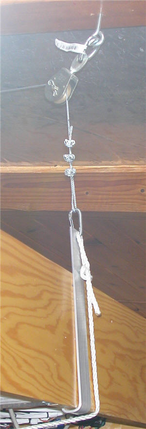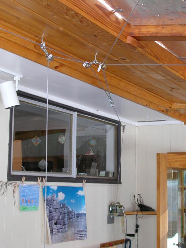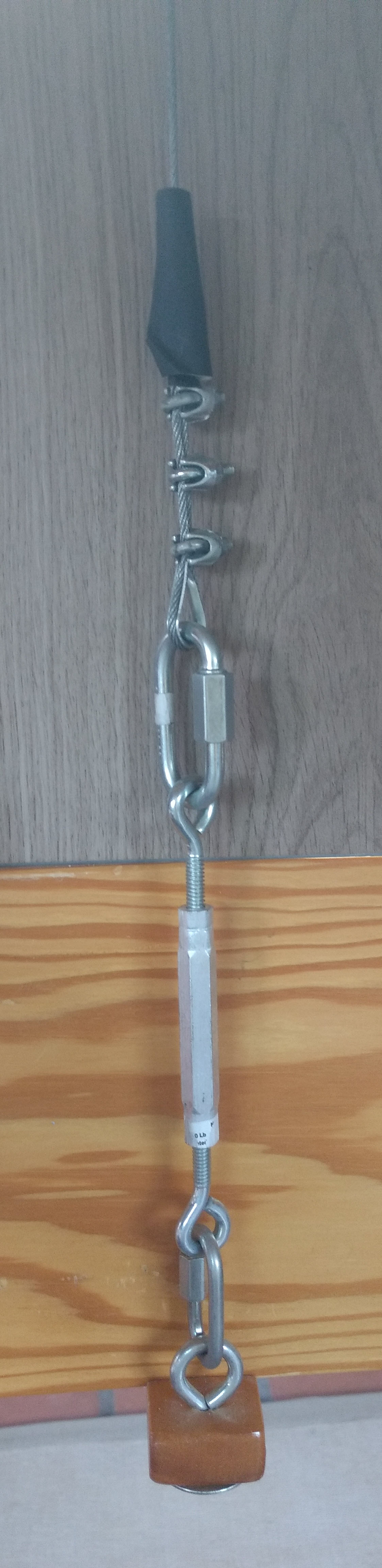 The J-hooks had another problem: How to properly level the layout? All I could do, aside from the imprecise and cumbersome method of adjusting the wire rope clamps, was to insert wafers of spacer material on the J. Layout leveling was much improved with the introduction of turnbuckles at the end of each wire rope, thus: