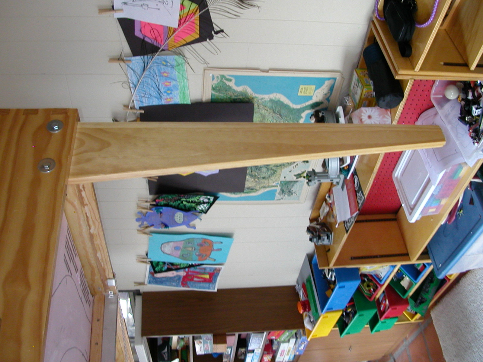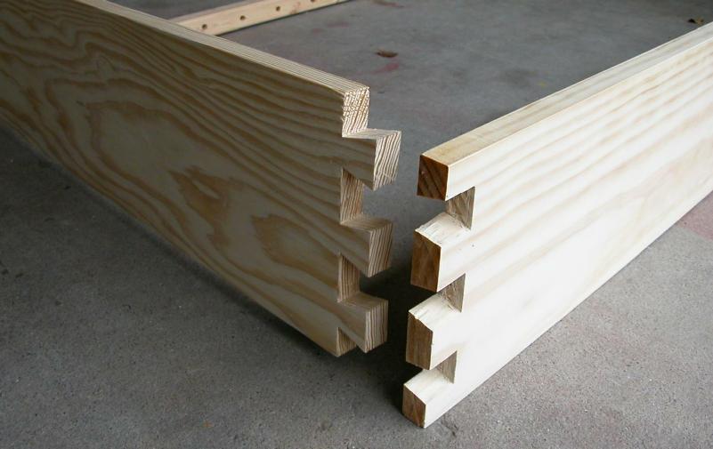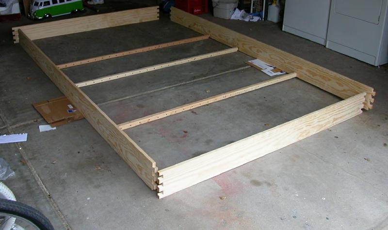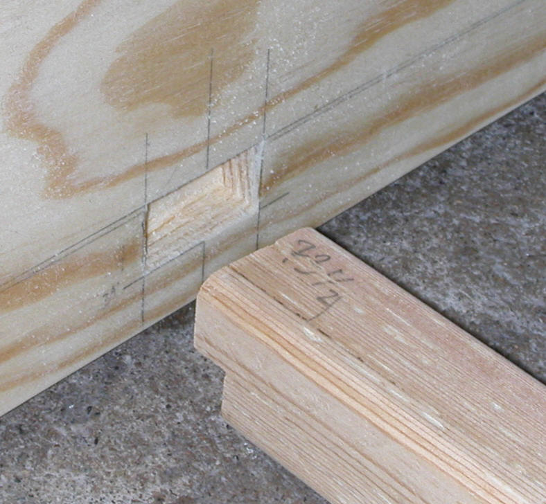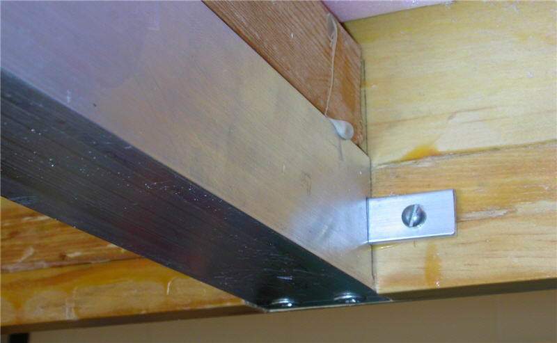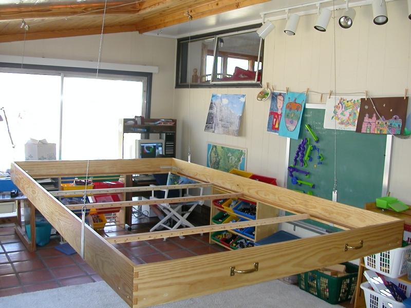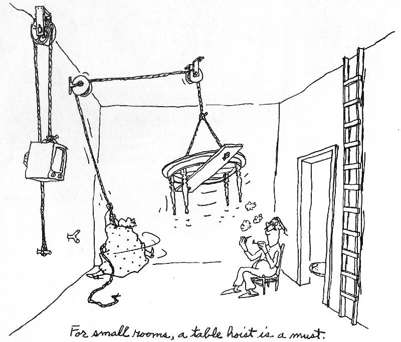 Suspended BenchworkThe "benchwork" is simply a frame, much like a bedframe, that surrounds and supports the foam base. Here it is, unassembled on the floor. It was later fitted with removable legs, so that the entire layout is portable. The outer frame is constructed from clear #1 grade pine 1×8s with a close, vertical grain. The crossmembers were unfortunately not so carefully chosen, built from lower-quality 2×2s. This later presented dimensional stability issues. Since I enjoy woodworking, I took some time on the frame to construct strong joinery: dovetails for the corners and blind mortise-and-tenon joints for the crossmembers. These are simple to cut with a hand saw and chisel. Each crossmember is also drilled through with many holes to allow for wiring. Much later (early 2009), I found I had underestimated the weight of the track, wiring, and scenery, and that these 2×2 crossmembers offered inadequate support, sagging up to 1 cm in the middle. Fast forward to 2009 when I ended up adding 1.5×1.5‑in aluminum box tubing underneath each one, which cut the sag to a millimeter or two. This retrofit required cutting off the nice wooden tenons, lifing the entire foam base by 1.5 inches, and installing the aluminum box below, glued to the wooden crossmember for added strength. The wooden 2×2 rests atop the aluminum, which was necessary since all the wiring already ran through the holes. Fortunately, the outer frame of 1×8 boards was tall enough to accommodate the extra 1.5‑inch rise. This proved to be a quite satisfactory arrangement. Here is a detail of the mounting of the aluminum box to the frame. Note how the sides of the box are notched to hang on the small crossbar, and the bottom edge of the box is extended into a mortised notch in the bottom of the frame to make it flush. I was so intimidated by the technical challenge of this retrofit that I spent about two months thinking about how it was to be accomplished. I am, however, quite pleased with the result. I have usually found that plenty of careful and detailed thinking beforehand makes a tough job easier. In the end, that retrofit was a good thing, as it provides more space underneath for the wiring and whatever I develop for a protective undercover. Now back to 2006 where I was just getting the frame put together... Once assembled, I mounted the frame temporarily on sawhorses until I could build the legs. This picture is obviously pre-retrofit. Now, there is always the problem of space. With three kids, we don't have a spare room that can be devoted to the layout. One can't just put a 6×10‑ft layout in the middle of the living room, apparently. We do have a sun room, with great light, and it's just big enough for a couple feet of walkaround room on each side, but it's also an otherwise useful room, and we want to keep it that way. It just so happens that we were browsing a wonderful book of George Booth cartoons. There was one section on keeping order in the home (in Booth's unique style, of course) with the following cartoon (which I have admittedly used without permission—sorry). I think Booth would agree that I have followed the spirit of that cartoon. Eureka! So I built a mechanism to hoist this portable layout frame to the ceiling (in the sun room) to keep the layout stowed out of the way when not on display. This is important since it will free up the garage for the winter, which helps preserve a happy household. Which permits me to continue this insanity... Here is the frame, initially supported by J-shaped hooks fashioned from 1‑in × 1/4‑in aluminum bar stock, raised to the ceiling. The ropes are there just to be a safety backup, since the J-hooks are not actually attached to the frame. I later replaced the J-hooks because I feared that they could come too easily disconnected from the layout, despite the white ropes meant to hold things in place. The new design supports cross-members that span width of the underside of the layout, so that there is no possible way that it could slip its moorings. If that ever happened and the layout should fall, it could be catastrophic. I shudder at the thought. Here is one of the crossmembers hanging at the end of a wire rope.