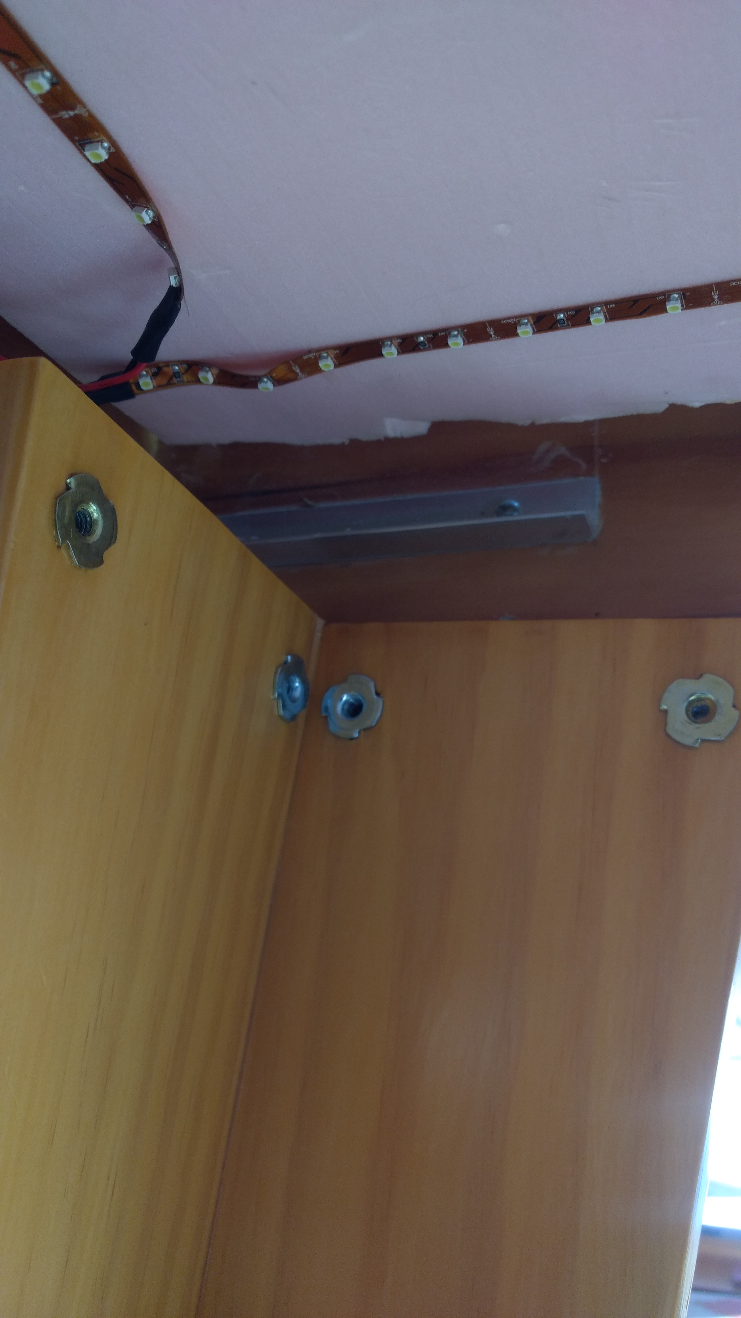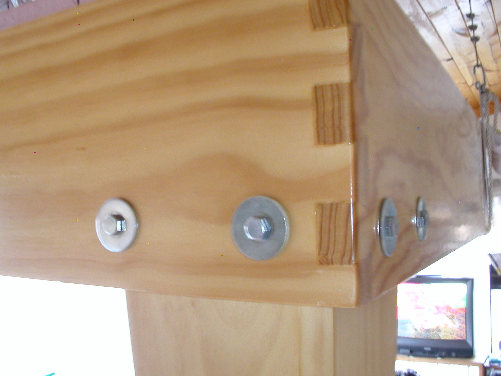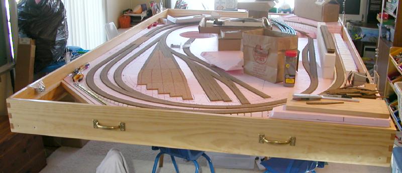The four steel cables (wire ropes) attached to the turnbuckles run over blocks attached to the ceiling, and then through another set of blocks to bring them all into line before being gathered into a single cable fed to a boat winch mounted to the wall. If you work out the geometry, you will see why the gathering of cables is necessary. And here it is, lowered to work/display level: The base is a three-layered, interlocking sandwich of 1‑inch thick pink insulation foam board, with a corner cut out where the control panel will reside. Here is that slab of foam board, with the cork roadbed laid out on top of it:The hanging mechanism is sturdy enough to work on the layout and keep the work in progress, tools, and whatnot all messy on the layout with no need to clean up. Just winch it up and out of the way! And the winched table arrangement is wonderful for adjusting table height to whatever is comfortable for the task at hand. Up it goes to work on the wiring. Down to work on the track. Way down to get to the center. I was also pleasantly surprised to discover that the trains run on it just fine with it hanging. I added 4 sturdy but removable legs at the corners, so that the layout could solidly rest on the floor. Not only does it provide a more stable surface for working on the layout, I found that guests will inadvertently lean a bit on the table, setting it to swinging a bit. Here is an attached leg, with the layout in the suspended position. These legs are made of the same 1× boards as the frame. Each leg has holes drilled through that line up with holes in the frame. On the insde of the leg, T-nuts are used to secure the mounting bolts. I had to be careful that the legs did not run afoul of anything installed below. You can see the short lengths of light aluminum angle that serve as an upper stop for the legs, but in truth the bolts hold all of the weight. The LED light strip runs the perimeter of the layout underneath, allowing the layout to double as a room lighting fixture. The leg is mounted using 1/4"‑20 hex head bolts. Easy and quick. |