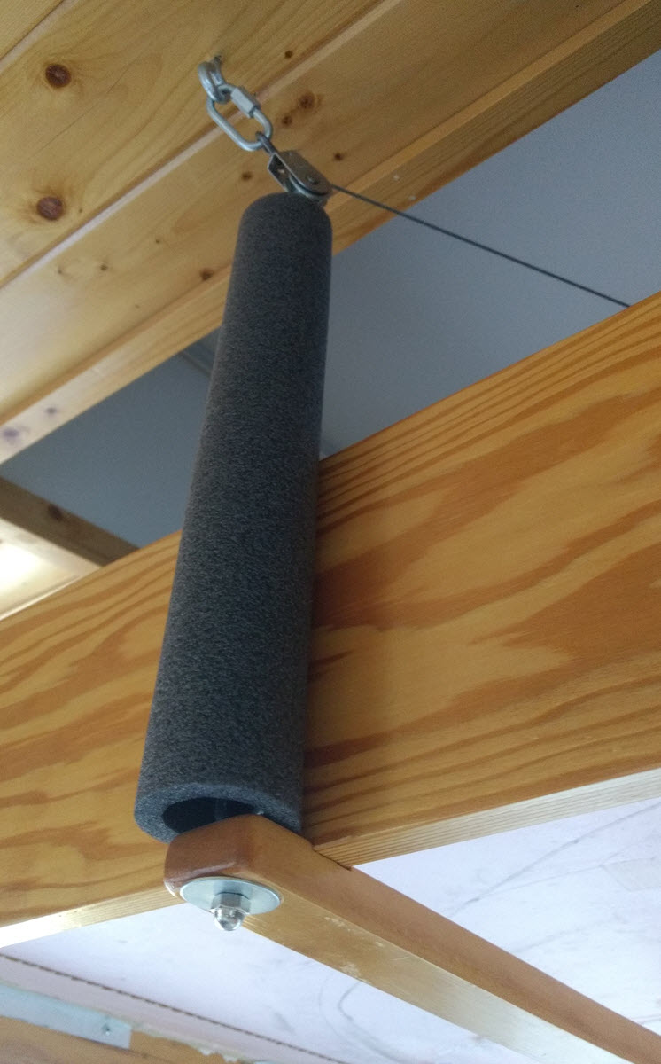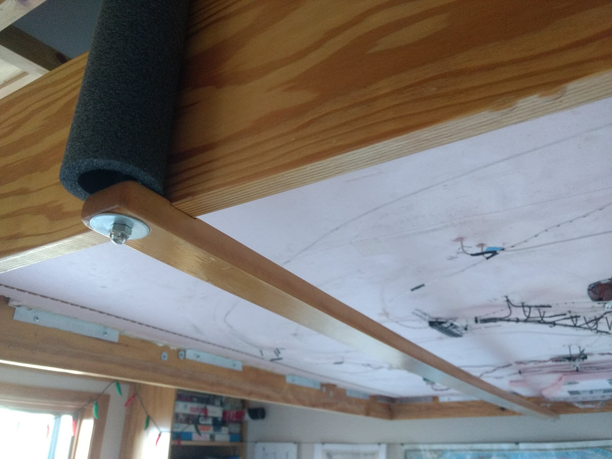 Although they worked a treat, this system shared another flaw with the previous one: As people scooted past these wire rope hangers in examining the layout, parts of the mechanism would catch on their clothing or even their arm. Of course, this happened to me more than to anyone else, so to address this annoyance I added these comfy and attractive foam covers, made from pipe insulation: